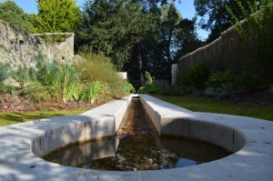 En retrait, situé sur ce que les Havrais appellent « la côte », le Carmel confronté à un projet immobilier apportant de nombreuses nuisances à sa vie monastique, a transformé cette nocivité en un projet positif, en créant à partir d’un dialogue avec l’architecte paysagiste Samuel Craquelin et deux artistes Chantal Giraud, plasticienne, et Jean-Pierre Lartisien, sculpteur, un jardin du silence, lieu de méditation, de recueillement, de réflexion, de contemplation de ce que peut être la beauté de la nature comme de la vie loin du tumulte et de l’effervescence du port et de la ville.Le visiteur, quelques soient ses convictions, y est le bienvenu. Il trouve ici un moment de calme, de paix intérieure, se trouvant confronté à des étapes riches de symboles.La cour minérale est composée en cercles concentriques autour d’un calvaire. Franchir ces cercles symbolise une entrée dans son intériorité. C’est une manière pour nous d’évoquer les Sept demeures du château intérieur, œuvre majeure de Sainte Thérèse d’Avila. Le jardin du silence s’appuie sur la vie de prière décrite par Sainte Thérèse d’Avila, les quatre manières d’arroser son jardin intérieur, autrement dit notre âme, en proposant un rapport visuel et évocateur entre le promeneur et le jardin.- Le puits, au sens de la méditation laborieuse, la noria, au sens de la méditation ouvrant sur "l’esquisse" d’une rencontre avec le Christ.- Le canal d’irrigation, au sens de la rencontre intérieure avec Jésus Christ s’approfondit et devient plus fréquente. L’eau s’écoule paisiblement, depuis la source vers le miroir d’eau.- L’espace de la pluie, la prière et le recueillement sont donnés par Dieu. La rencontre devient alliance et source pour agir. La pluie nourrit la pelouse à l’image des prairies cauchoises et calcaires.Chantal Giraud a conçu la noria en verre diaphane, un matériau "métamorphosé, sculpté par le feu" permettant d’intéressants jeux de lumière. Son dessin évoque le mouvement, le ruissellement de l’eau puisée. La croix de lumière, située sur la place des 7 demeures est fabriquée dans le même matériau. Un motif sculpté de nervures anime le verre, tel un arbre de vie.