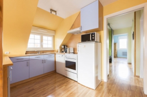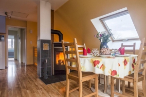 Le séjour avec accès direct à la terrasse vous offre une belle vue sur la Plaine d'Alsace. En hiver, le feu de bois dans le poêle suédois vous apportera chaleur et convivialité. Le coin cuisine est équipé de tout ce qu'il vous faudra.