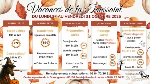 Voici le programme du centre équestre pour les vacances de la Toussaint !Lundi 27 octobre :10h à 12h : Stage voltige (27€ / participant)14h à 17h : Cours collectif (27€ / participant)Mardi 28 octobre :Journée complète en randonnée (55€ / participant)► Emportez votre pique-nique► Être à l'aise aux 3 alluresMercredi 29 octobre :10h à 13h : Demi-journée préparation au Galop (38€ / participant)10h à 17h : Journée préparation au Galop (55€ / participant)Jeudi 30 octobre :10h à 17h : Passage Galop (Avec stage : 22€ / participant - Hors stage : 35€ / participant)Vendredi 31 octobre : Venez déguisés !10h à 13h : Demi-journée Halloween - Jeux à poney / Balades (38€ / participant)10h à 17h : Journée Halloween - Jeux à poney / Balades (55€ / participant)► Emportez votre pique-niqueInformation pratique :Sur réservation par téléphone : 06 84 72 36 51