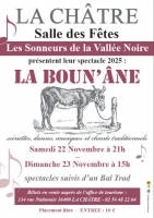 Spectacle annuel des Sonneurs de la Vallée Noire "La Boun' Ane" de saynètes, danses, musiques et chants traditionnels des Sonneurs de la Vallée Noire. Un spectacle est prévu le samedi soir à 21h et le dimanche à 15h. Un bal suivra les spectacles. Placement libre.