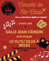 L'Harmonie l'Avenir d'OYE-PLAGE présente son concert de la Sainte-Cécile le samedi 15/11, salle Jean-Crinon à 19h30.Restauration et buvette sur place.Entrée gratuite